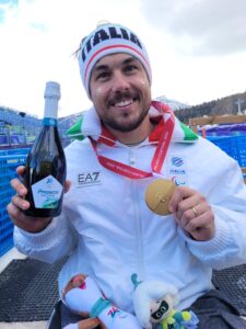 L’atleta azzurro, portabandiera dell’Italia, conquista l’oro e l’argento ai Giochi Paralimpici Invernali brindando con le bollicine ufficiali della manifestazione.